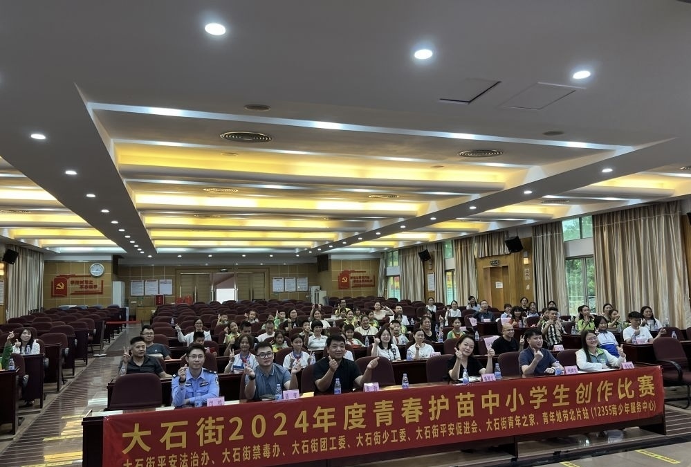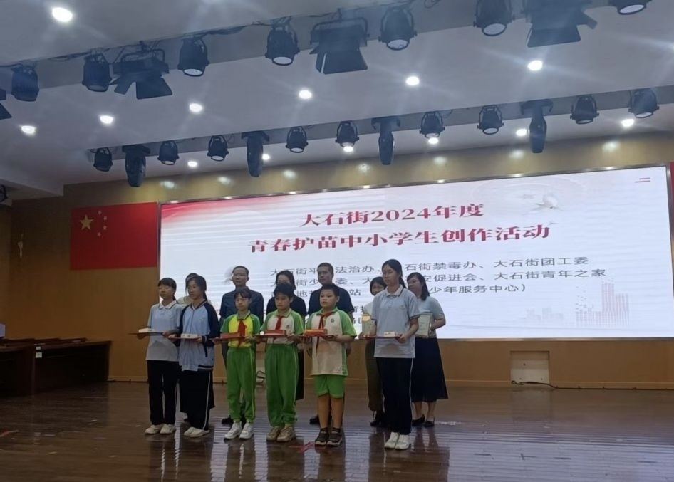 近日,广州市番禺大石街2024年度青春护苗中小学生创作比赛颁奖典礼在大石街道办举行。大石街相关领导,北片教育指导中心、番禺区公安分局区禁毒大队、大石街平安法治办、大石街团工委、青年地带北片站、大石街禁毒办等单位的领导,与获奖师生参与活动。