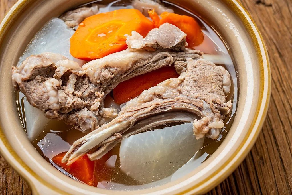 做法:红萝卜洗净去皮切块、玉米洗净切段、竹蔗洗净开边切段、茅根、马蹄洗净备用、羊腿洗净切块焯水备用,生姜洗净切片拍扁。把准备好的材料放入瓦锅中,加入清水4000ml,大火煮沸后,改用中火煲约1-1.5小时,调入适量食盐即可食用。