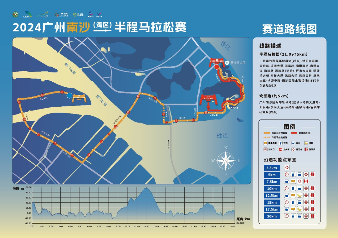 广州南沙国际邮轮母港(起点)一港前大道南(顺行)一天后路(双向全幅)一滨海大道(双向全幅)一海滨路(顺行)一南横南路(顺行)一霍英东研究院(终点)