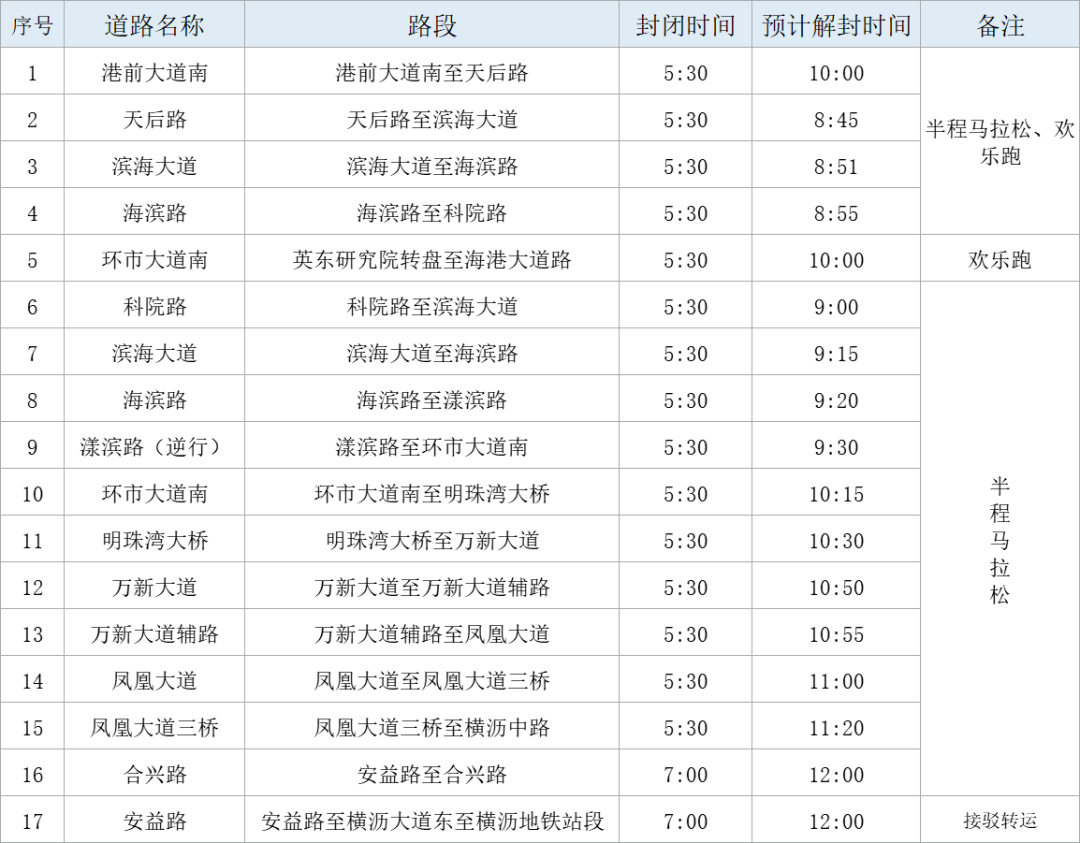 (一)11月29日22:00至12月1日10:00,临时交通管制封闭起点港前大道南(蒲洲广场路口到商贸南二路往天后路方向)即南沙客运港站D出口红绿灯路口,港前大道南(北往南)单边车道,商贸南二路(东往西)单边车道,进行起点拱门、舞台等赛前设施施工(含11月30日6:30至8:30彩排),搭建好后施工单位做好警示提示,车辆不能通行;