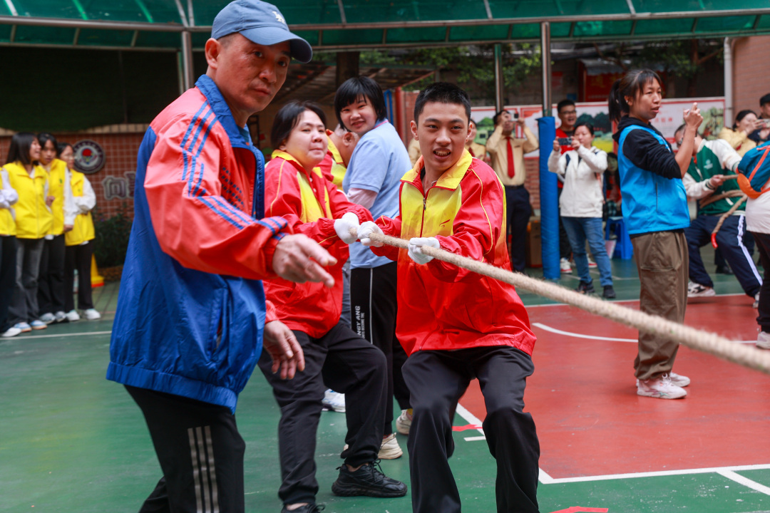 在拔河比赛现场,由各康园工疗站学员组成的两队队员扎稳马步、蓄势待发,随着裁判的一声哨响,比赛正式开始。运动员们紧攥绳子,奋力后拉,红丝带在判定线来回摇摆,现场气氛紧张到极点。啦啦队的加油声、观众的呐喊声交织在一起,为比赛增添了无尽的激情与活力。