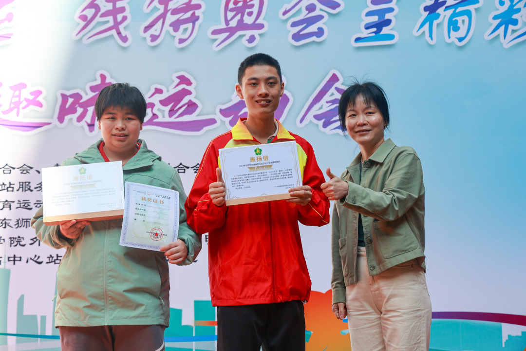 随着各项比赛项目的圆满落幕,广州市残联、越秀区残联参会嘉宾为2024年全国残奥运动会获奖运动员送上表扬信,并为拔河比赛、篮球障碍赛的冠亚季军颁发了奖杯。