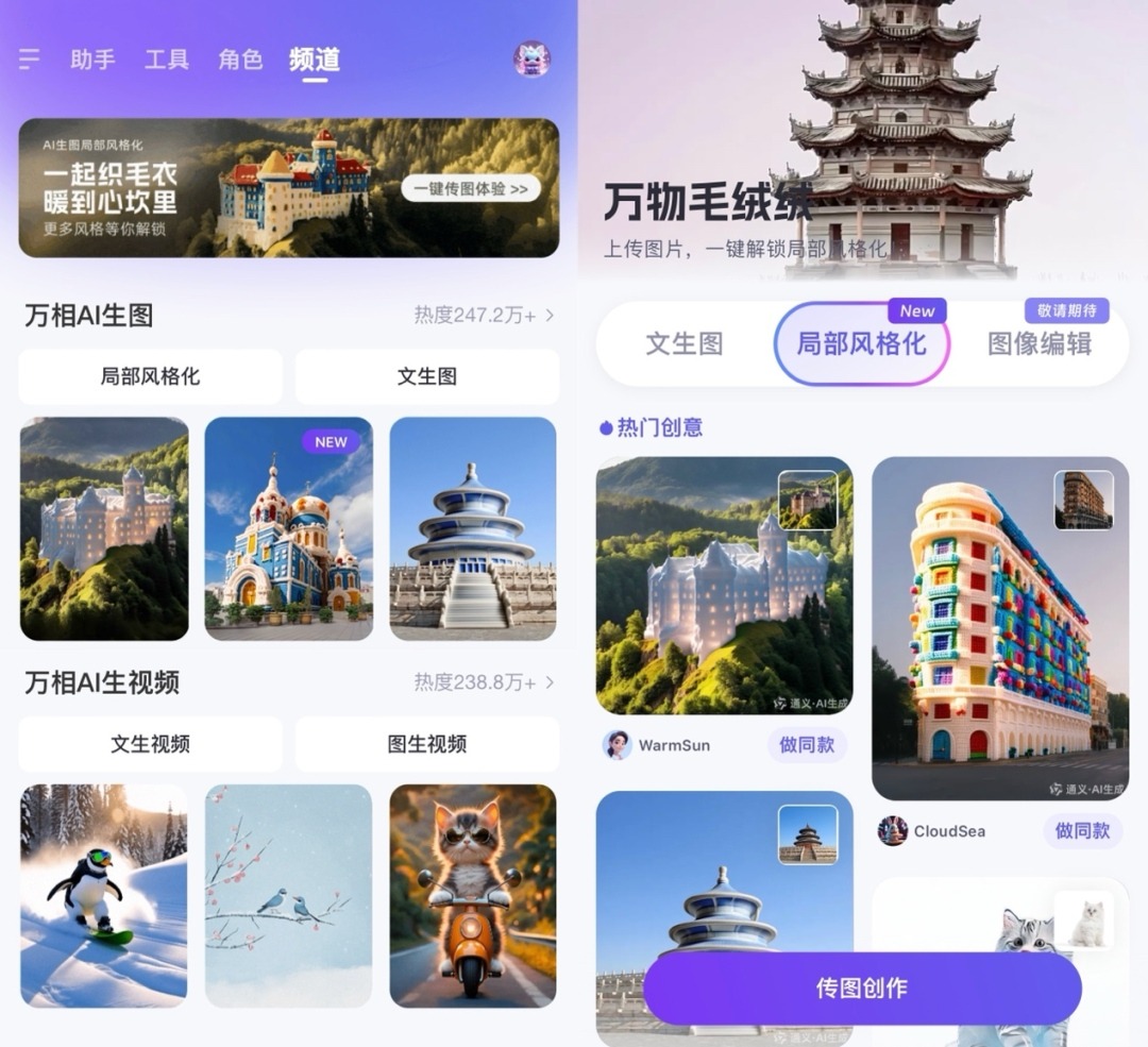 新一轮冷空气来袭,北京天坛、上海武康大楼、杭州六和塔等地知名地标仿佛一夜间都“穿上”了彩色毛衣。原来,近日通义App上线了“局部风格化”功能,这功能在社交平台上掀起了一阵“毛茸茸”旋风。