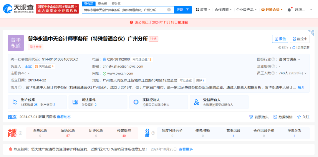 11月25日,天眼查显示,近日,普华永道中天会计师事务所(特殊普通合伙)广州分所经营状态变更为注销。该分所成立于2013年4月,负责人为王斌,经营范围为企业管理咨询服务、企业财务咨询服务、代理记账服务、会计师事务所,总公司为普华永道中天会计师事务所(特殊普通合伙)。