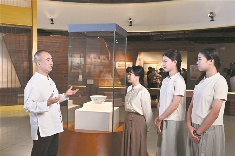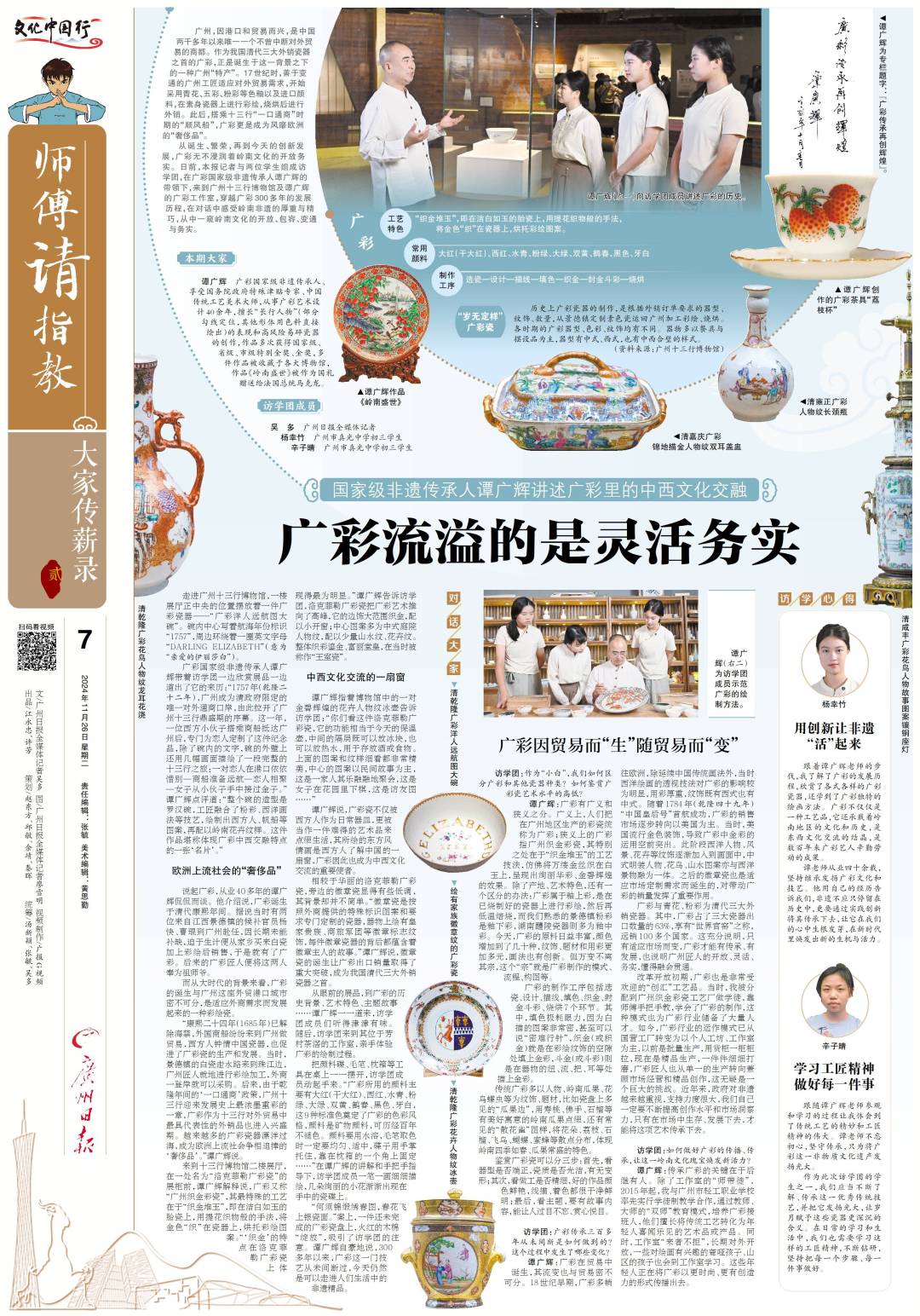 从诞生、繁荣,再到今天的创新发展,广彩无不浸润着岭南文化的开放务实。日前,广州日报记者与两位学生组成访学团,在广彩国家级非遗传承人谭广辉的带领下,来到广州十三行博物馆及谭广辉的广彩工作室,穿越广彩300多年的发展历程,在对话中感受岭南非遗的厚重与精巧,从中一窥岭南文化的开放、包容、变通与务实。