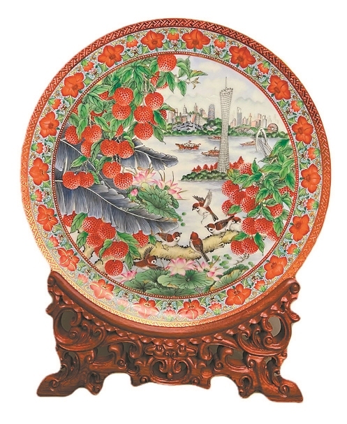 传统广彩多以人物、岭南瓜果、花鸟蝶虫等为纹饰、题材,比如瓷盘上多见的“瓜果边”,用寿桃、佛手、石榴等有美好寓意的岭南瓜果点缀,还有常见的“散花雀”图样,将花朵、荔枝、石榴、飞鸟、蝴蝶、蜜蜂等散点分布,体现岭南四季如春、瓜果常盛的特色。