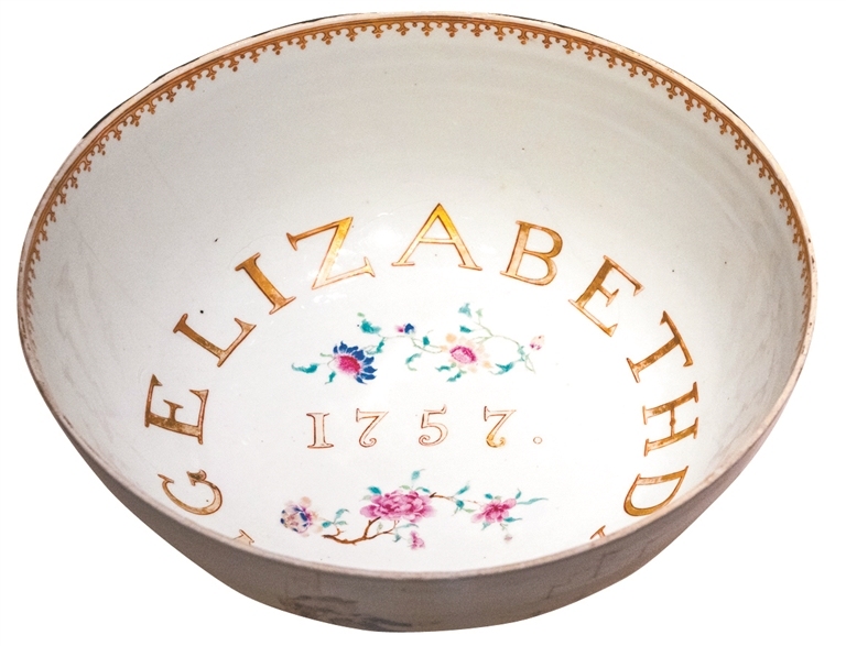 走进广州十三行博物馆,一楼展厅正中央的位置摆放着一件广彩瓷器——“广彩洋人远航图大碗”。碗内中心写着航海年份标识“1757”,周边环绕着一圈英文字母“DARLINGELIZABETH”(意为“亲爱的伊丽莎白”)。