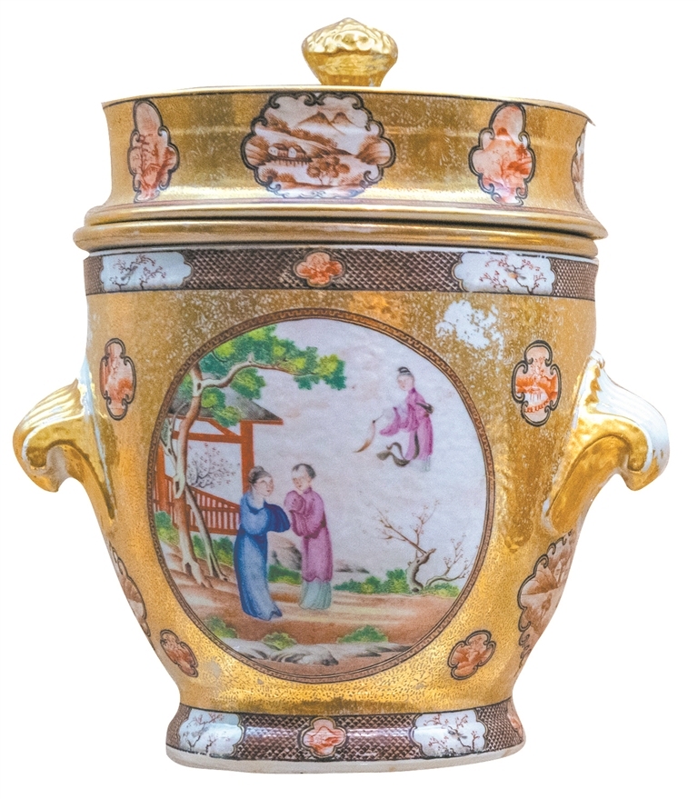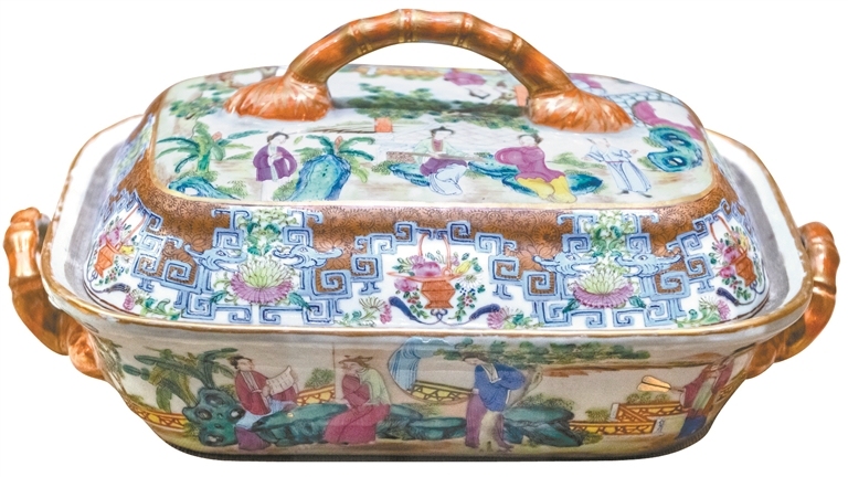 谭广辉:广彩在贸易中诞生,其流变也与贸易密不可分。18世纪早期,广彩多销往欧洲,除延续中国传统画法外,当时西洋绘画的透视技法对广彩的影响较为明显,用彩厚重,纹饰既有西式也有中式。随着1784年(乾隆四十九年)“中国皇后号”首航成功,广彩的销售市场逐步转向以美国为主。当时,美国流行金色装饰,导致广彩中金彩的运用空前突出。此阶段西洋人物、风景、花卉等纹饰逐渐加入到画面中,中式明装人物、花鸟、山水图案亦与西洋景物融为一体。之后的徽章瓷也是适应市场定制需求而诞生的,对带动广彩的销量发挥了重要作用。