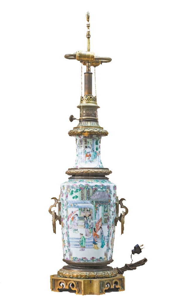 清咸丰广彩花鸟人物故事图案镶铜座灯