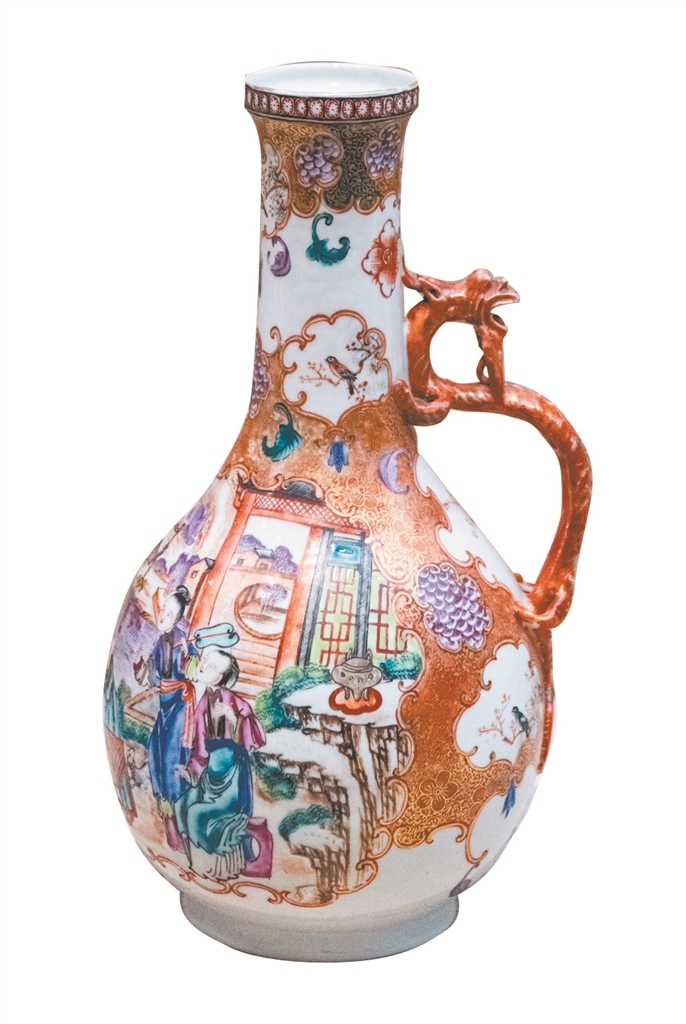 清乾隆广彩花鸟人物纹龙耳花浇