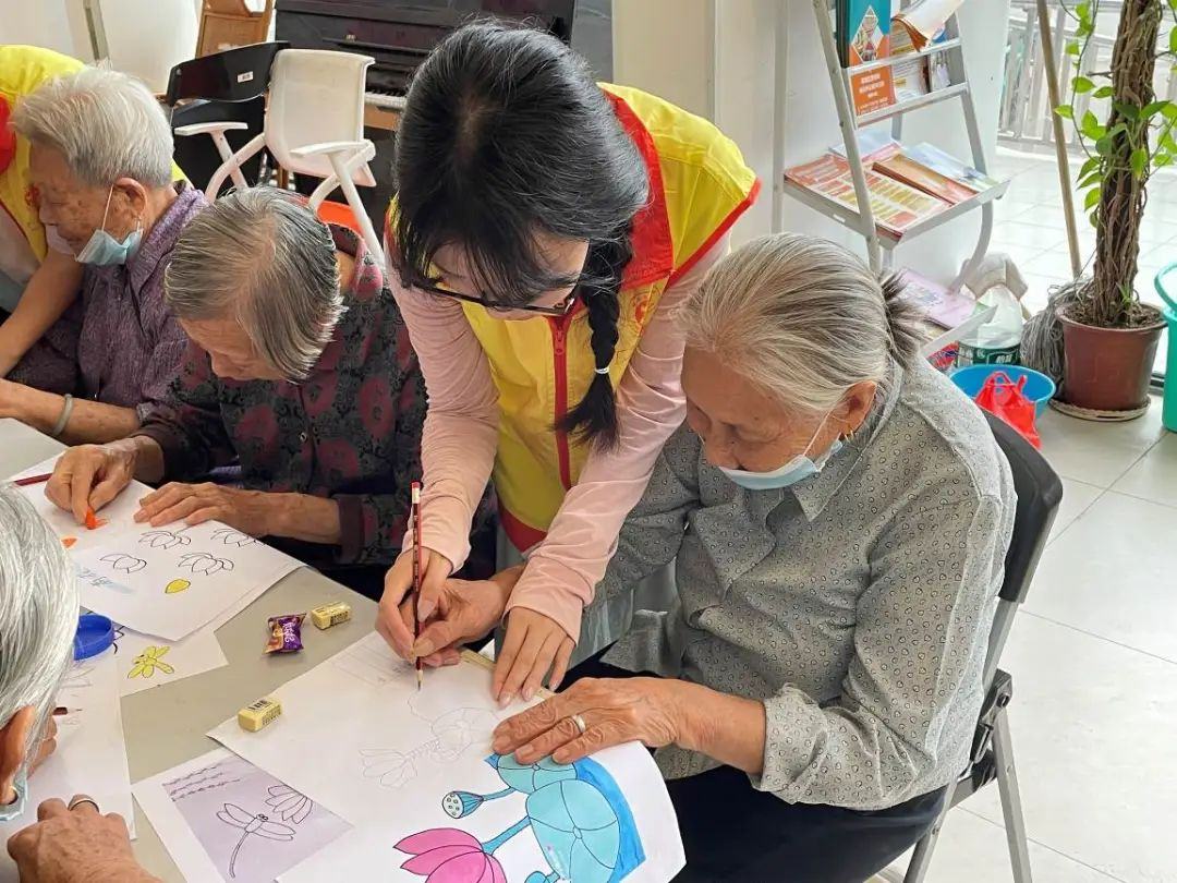活动中,每名志愿者服务两名长者,帮助他们进行以“心中的荷花”为题的心灵绘画。从构图技巧到绘画细节,志愿者耐心地鼓励和引导老人家打开内心,随心所欲地勾勒笔画、上色,把内心的想法呈现在画纸上。