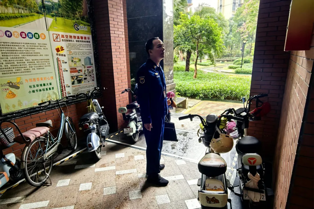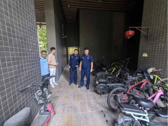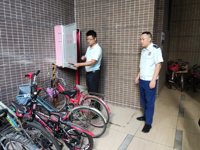 检查组着重检查了住宅小区内电动自行车是否有进楼入户的情况,是否在公共门厅、疏散通道、楼梯间以及安全出口处违规停放,是否存在“飞线充电”等问题。在此期间,检查组对工作人员的应知应会内容进行了提问,并要求物业管理公司务必切实强化日常监管与巡查力度,以确保能够及时察觉并消除各类安全隐患。