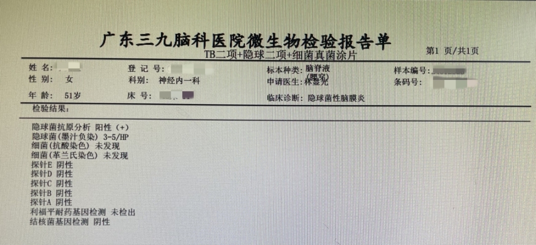 该院神经内一科副主任匡祖颖接诊后,怀疑患者是脑膜炎的可能性较大。最终通过腰穿检查在患者的脑脊液涂片中发现了隐球菌,从而确诊为隐球菌脑膜炎。