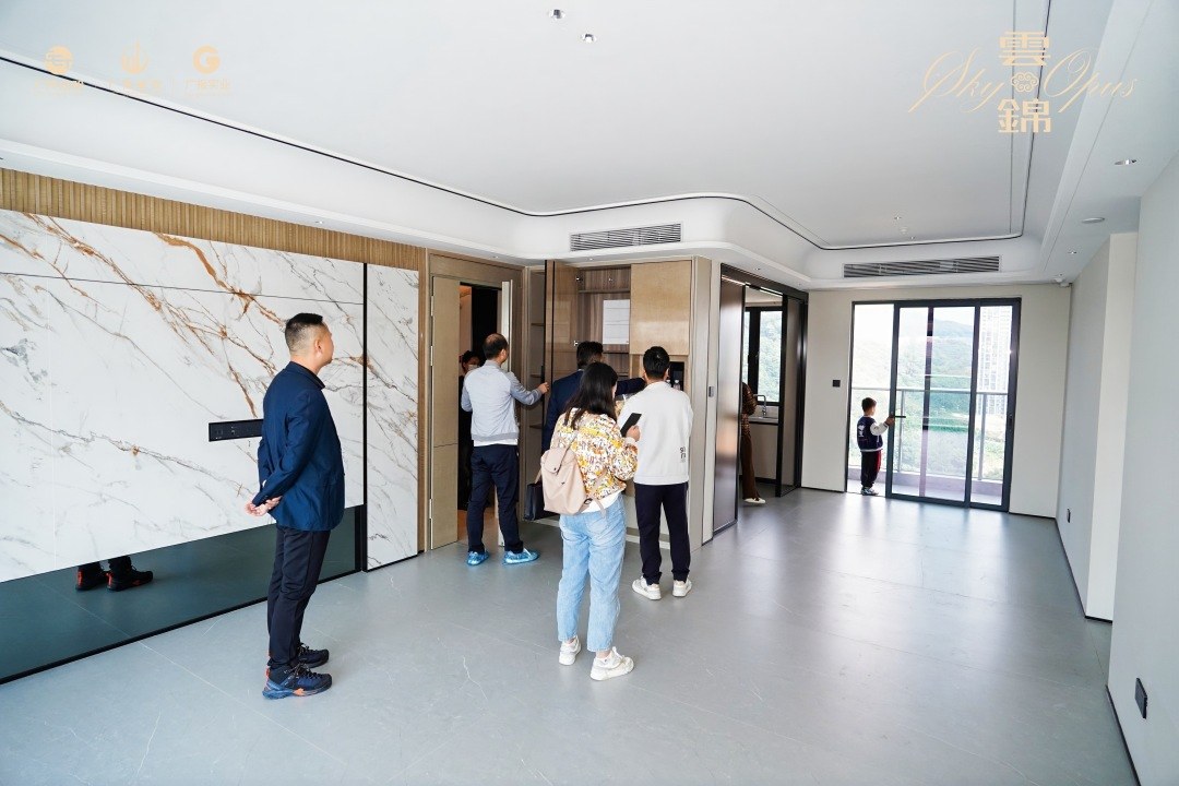从交付现场来看,开控城投·云锦兑现并展现出长岭居至优改善品质大盘的承诺。项目的大门和前庭,把归家仪式感的传承做到了极致。挑高的入口大门,人车分流的动线设计,彰显出气势与威仪。温润如玉的白色石纹界面,创新点缀上玫瑰金色与银色铝材,在东方美学的意境之中,又融入简约的现代审美。
