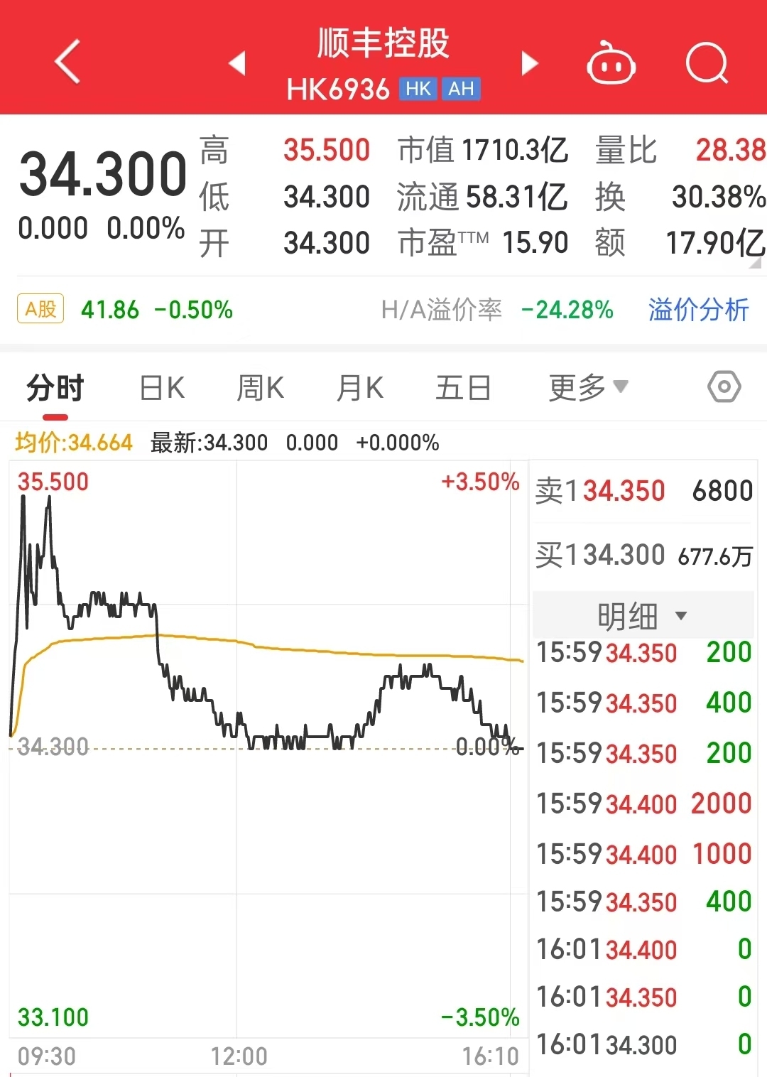 上市首日,顺丰控股H股以34.3港元/股开盘,最高涨至35.5港元/股,最终收盘于34.3港元/股,收盘价与招股价持平。若未行使超配权,顺丰募集资金净额达到56.62亿港元,成年内香港的第二大规模IPO。