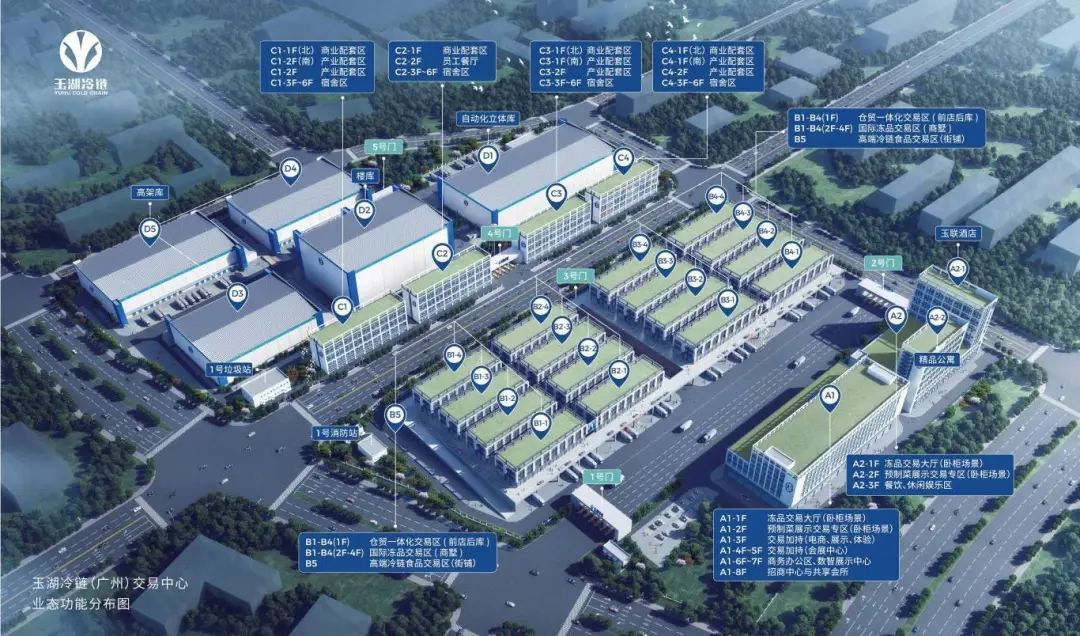 玉湖冷链市场(广州)交易中心位于花都区,用地面积312亩,建筑面积逾38万平方米,包括交易区、冷库区和配套区。其中有约13万平方米冻品交易区、超1200个交易单元,有约12.4万吨库容的冷库区,冷库有5栋。有超7万平方米配套区,含综合加工配送区、办公区域、沿街商业配套以及超650套公寓及宿舍、2300个停车位等。建有9万平方米全园贯通的地下转运中心,24小时全天候温控运转。该中心具备全自动立体冷库,操作全部无人化,可24小时运转。