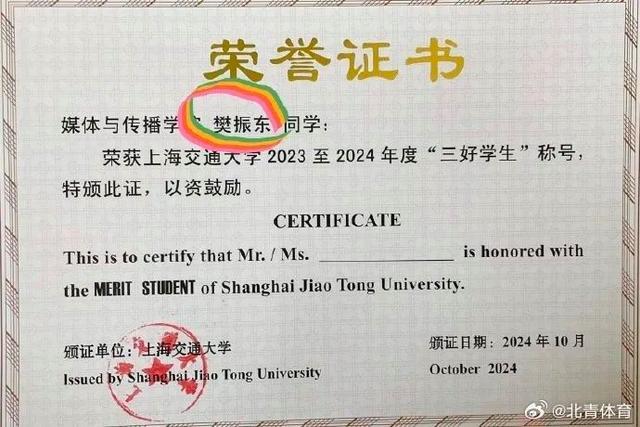 11月27日,据北青体育,一位自称是上海交通大学的学生在社交媒体上发文称,自己去学校交材料的时候发现樊振东的一张“三好学生奖”,听说一个月了至今无人领取,并表示:“樊振东同学,你的三好学生证书忘领了。”