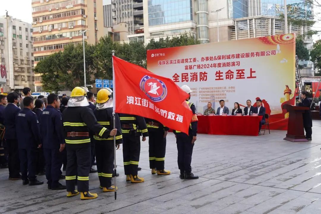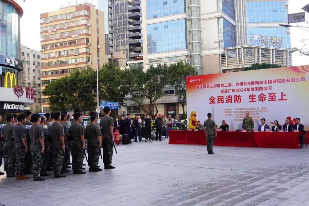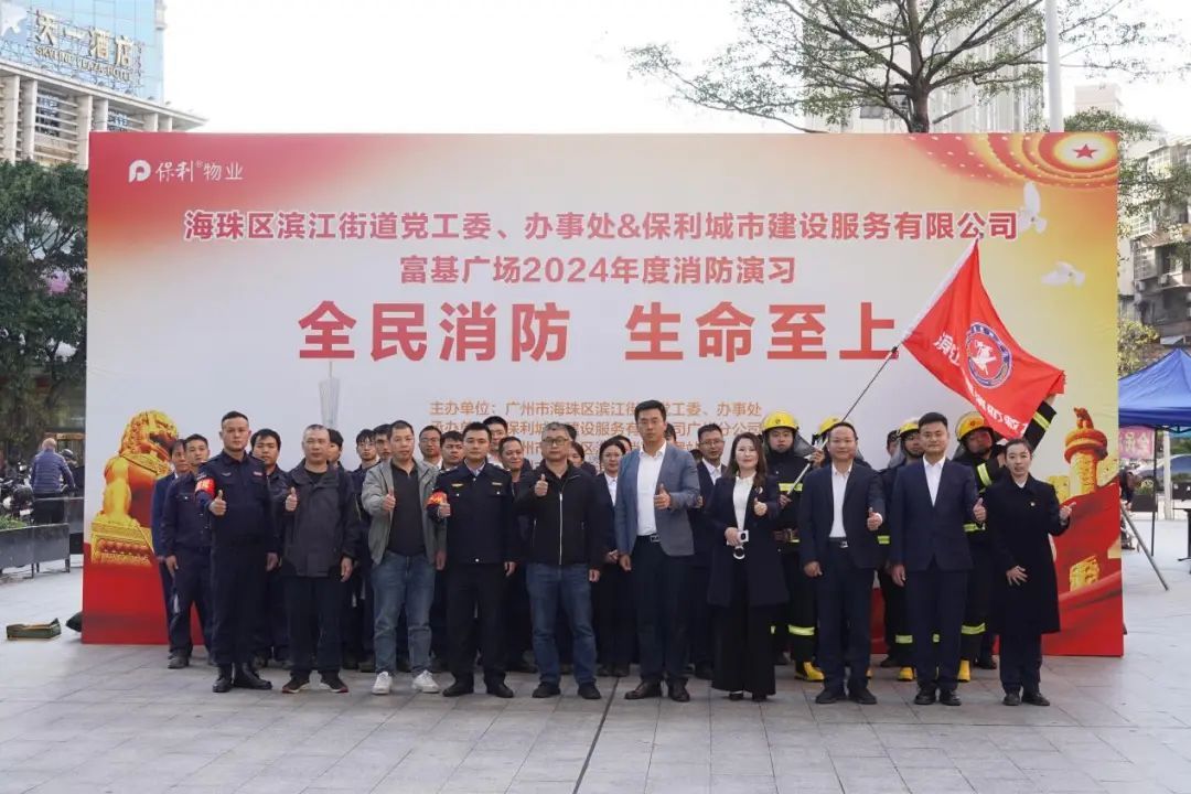 11月27日下午,保利富基广场空地前人头攒动,一场以“全民消防,生命至上”为主题的消防演习在此举行。此次演习由广州市海珠区滨江街道党工委、办事处主办,保利城市建设服务有限公司广州分公司承办,广州市海珠区海印消防救援站、广州市海珠区滨江街道派出所、广州市富基房地产开发有限公司协办,旨在提高居民的消防安全意识,增强应对突发事件的能力,确保群众生命财产安全。
