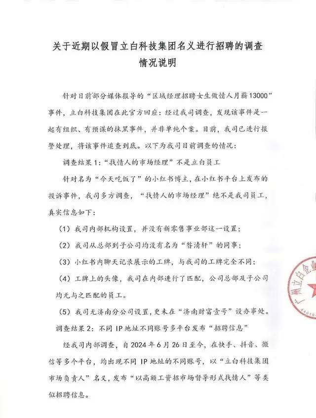 立白在情况说明中,经公司内部调查,自2024年6月26日至今,在快手、抖音、微信等多个平台,均出现不同IP地址的不同账号,以“立白科技集团市场负责人”名义,发布“以高额工资招市场督导形式找情人”等类似招聘信息。立白同时提醒广大应聘者,公司招聘信息仅通过猎聘、前程、智联、BOSS直聘等官方招聘网站发布,其余渠道一律为虚假信息。