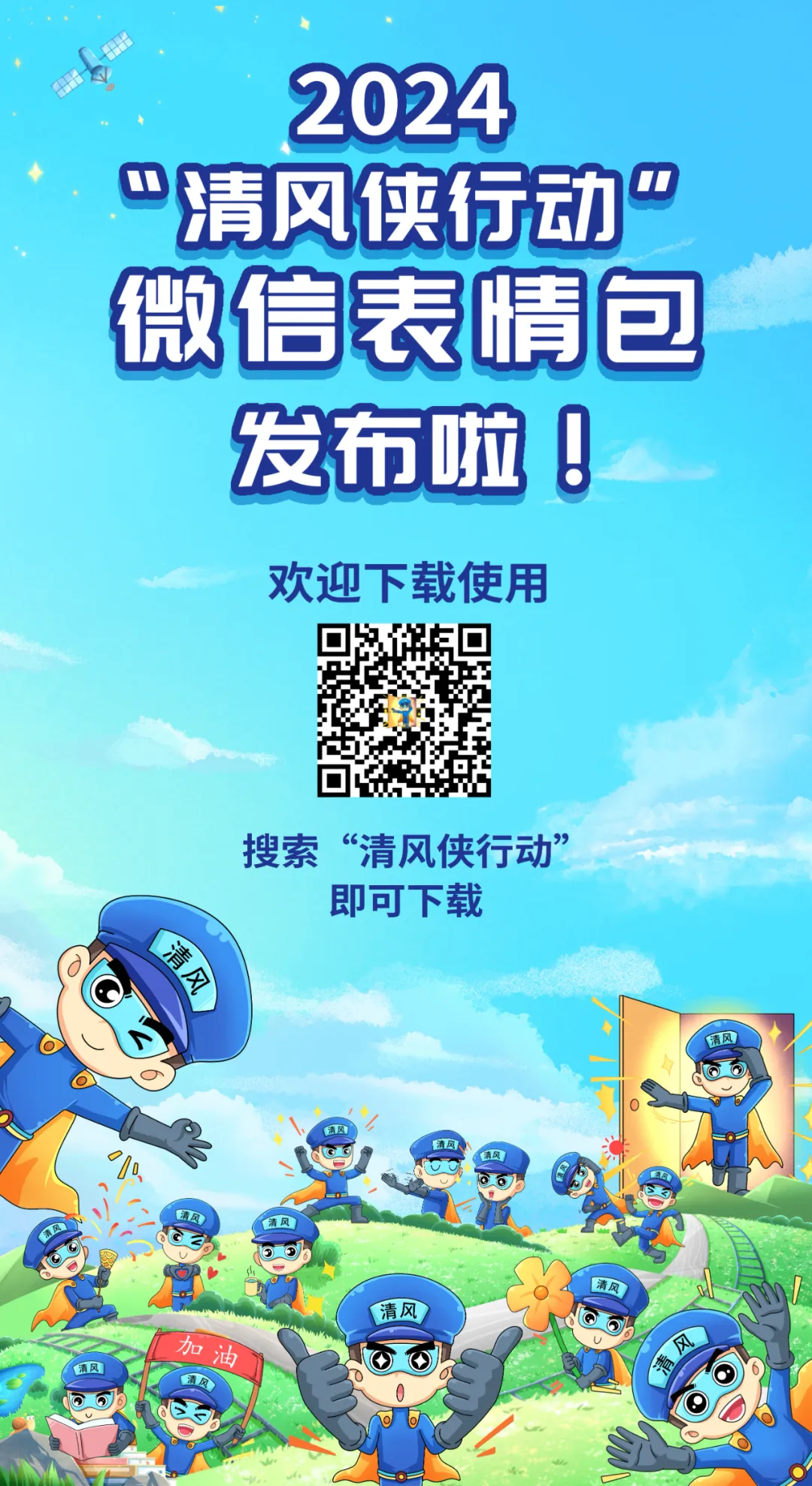 现在,只要扫描识别以下二维码或在微信表情中搜索“清风侠行动”,就可以立即拥有这套可爱又具有满满正能量的表情包。