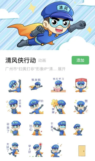 记者了解到,2020年广州率先推出全国第一款“扫黄打非清风侠”微信表情包,今年,以“清风侠行动”为主题的新版表情包,对清风侠的形象进行了优化提升,16款动图表情,以更潮流更可爱的表达形式,融入市民群众的日常网上社交传播,吸引更多人关注和支持“扫黄打非”“护苗行动”。“清风侠”倡导“绿色阅读、文明上网、自觉抵制非法出版物和有害信息”,积极传播正能量。