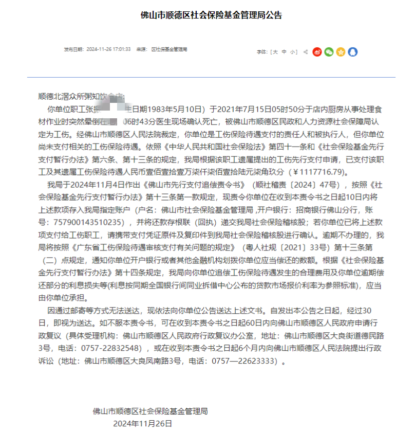 11月26日,顺德区社会保险基金管理局在其官网向顺德北滘众所粥知饮食店发起公告。根据该局11月4日作出《佛山市先行支付追偿责令书》(顺社稽责〔2024〕45号),按照《社会保险基金先行支付暂行办法》第十三条第一款规定,责令顺德北滘众所粥知饮食店在收到责令书之日起10日内将上述款项存入该局指定账户。