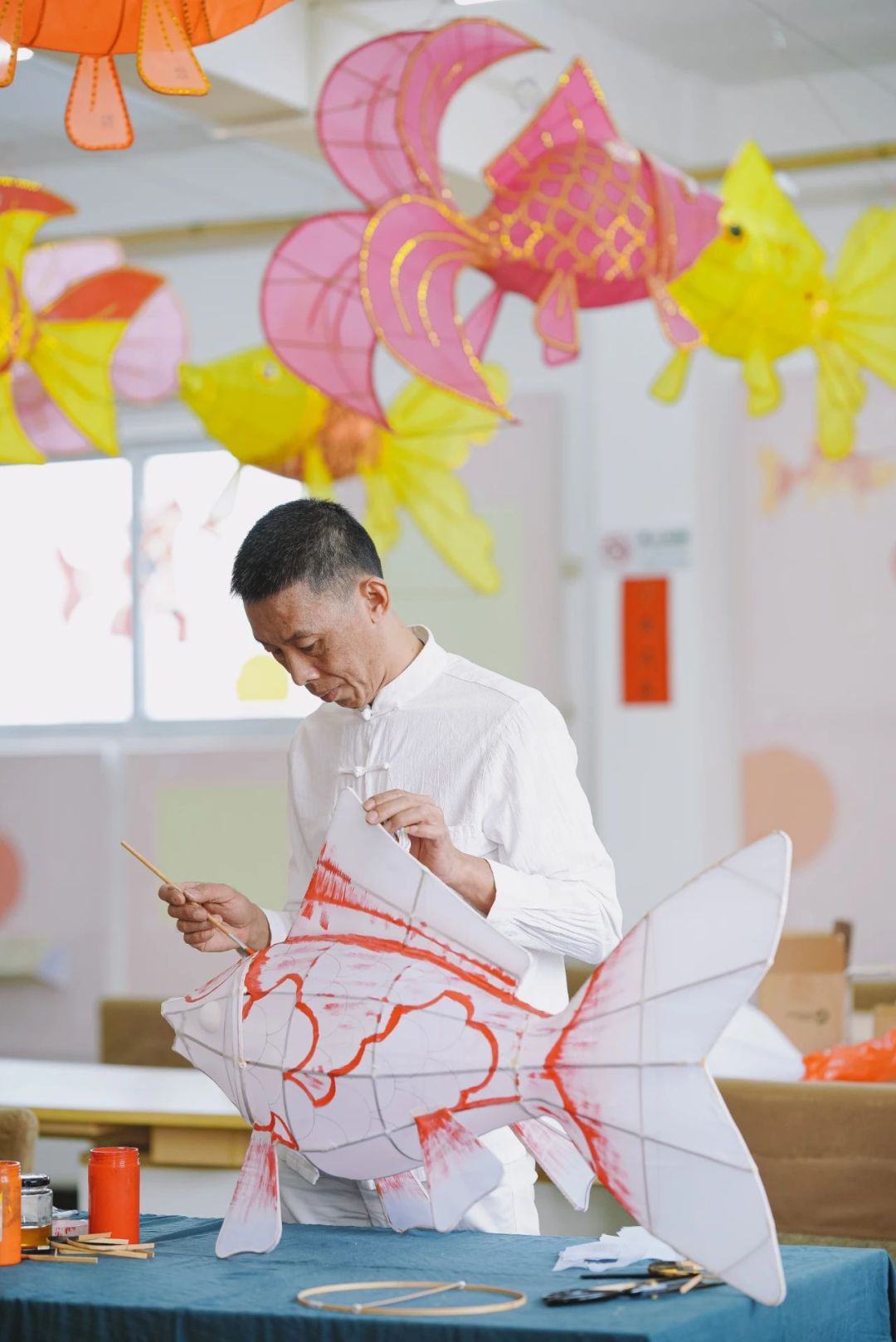 区级代表性传承人潘智江在进行鱼灯着色