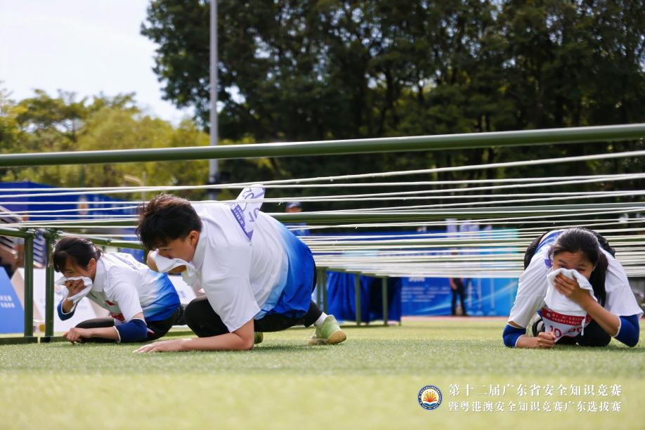 “火场逃生”主要是检验选手在特定火灾环境下的自救能力,选手们浇湿毛巾后折叠捂住口鼻,在网下以匍匐姿势,谨慎穿越充满模拟火焰和烟雾的区域,确保身体不触碰到网的边界。