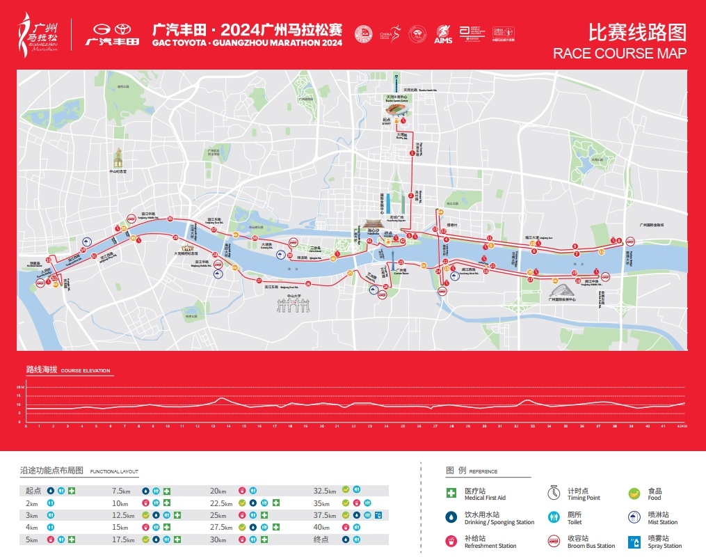 据介绍,广汽丰田·2024广州马拉松赛将于12月8日(星期日)鸣枪起跑,比赛设马拉松项目,赛事规模26,000人。比赛采用分枪起跑,A、B、C区的选手发枪时间为7:30,关门时间为13:45;D、E、F区的选手发枪时间为7:50,关门时间为14:05。赛事起点设在天河体育中心南广场,终点设在海心沙。赛道沿用“一江两岸”路线,比赛路线已由世界田联A级丈量员完成丈量。