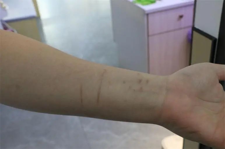 许文烨手臂上被小动物们抓伤留下的疤痕