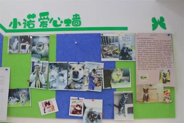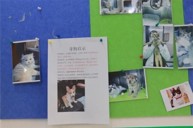 爱诺尔宠物医院进门处设有爱心墙,除了有小动物们可爱的照片,还张贴了“寻狗启示”和一封给予爱诺尔宠物医院医护工作者的感谢信。