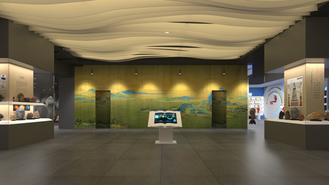 不仅如此,博物馆内还能看到北宋《千里江山图》的矿石墙绘。该矿石墙绘运用了蓝铜矿、孔雀石、青金石、朱砂、雌黄、赭石等具有中国色彩的珠宝矿物颜料,在设色和笔法上继承了隋唐以来的“青绿山水”画法。