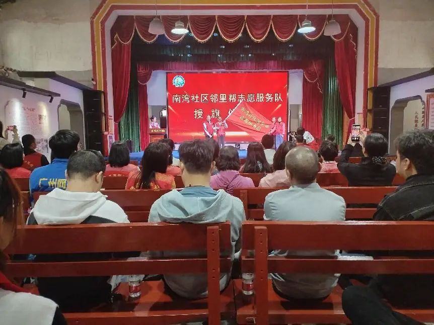 活动当日,社区居民在南湾乡村礼堂见证了南湾社区“邻里帮志愿服务队”的成立。南湾社区第一书记蒋波、南湾社区党委书记周永坚、南湾社区党委副书记麦美仪共同为志愿服务队队长秦婉娴授旗,并为全体队员颁发任命书。南湾社区“邻里帮志愿服务队”坚持党建引领,由社区党员、团员、网格管理员及热心居民共同组成,构建起多元主体共同参与基层治理的基层党建新格局。
