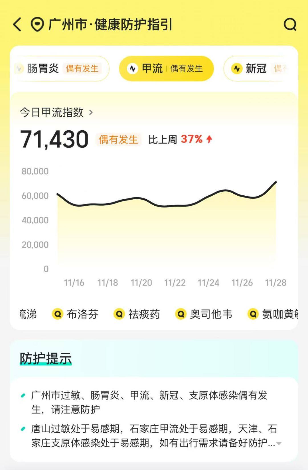 美团买药健康防护指引显示,广州当前甲流指数较上周有所增加。其发布防护提示称:广州过敏、肠胃炎、甲流、新冠、支原体感染偶有发生,需要注意防护。在美团买药平台,记者发现,近期感冒发烧用药销量较大,针对儿童的布洛芬混悬液月售超过10万件。