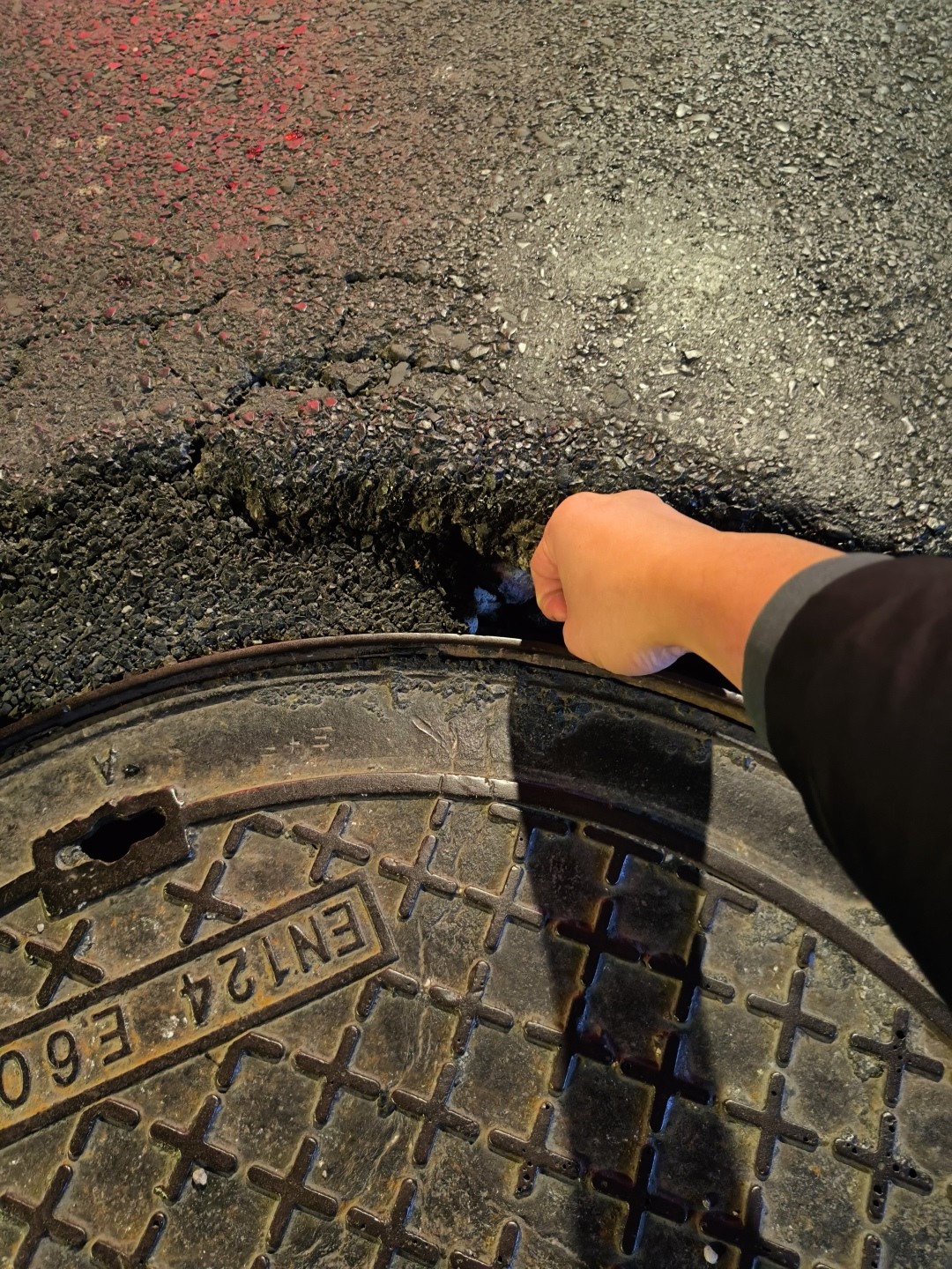 当天晚上,记者和陈先生一同来到红岗路(红庙村)路段。该路段为双向两车道,路面存在多处凹陷,其中一处沙井盖凹陷较深。记者用手比划了一下,沙井盖凹向地面约有大半个拳头,并与路面形成高度差,仿如一个凹坑。