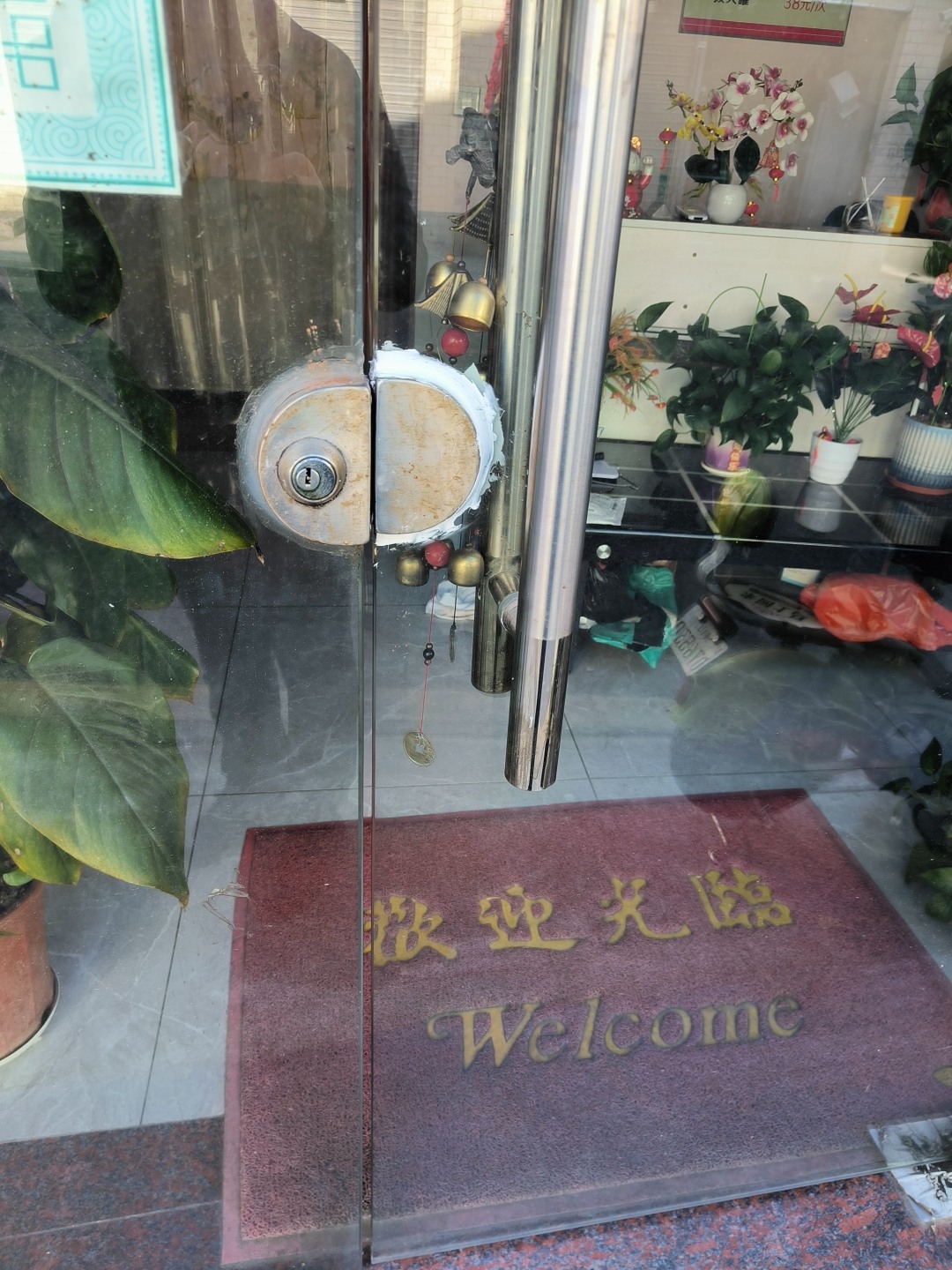 女店主说,她用玻璃胶把震掉的玻璃门锁孔粘上了