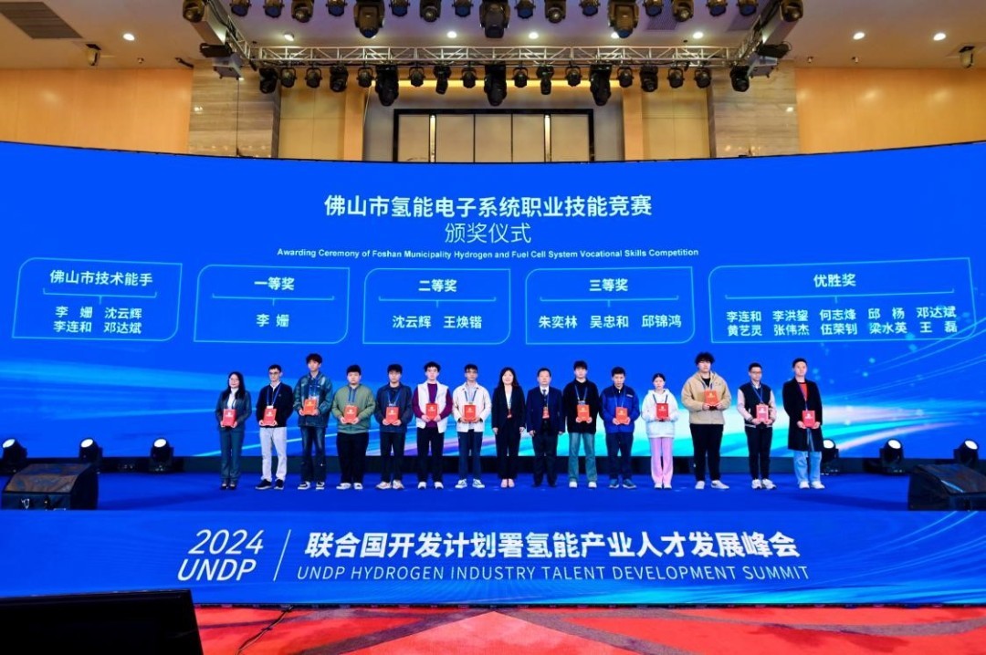 峰会期间举办的佛山市氢能电子系统职业技能竞赛圆满落幕,95名选手经过激烈角逐,最终16名表现优异者获奖,其中4人荣获“佛山市技术能手”称号。颁奖仪式上,来自联合国开发计划署驻华代表处(UNDP China)项目管理办公室及实施办公室的代表为获奖选手颁发荣誉证书。