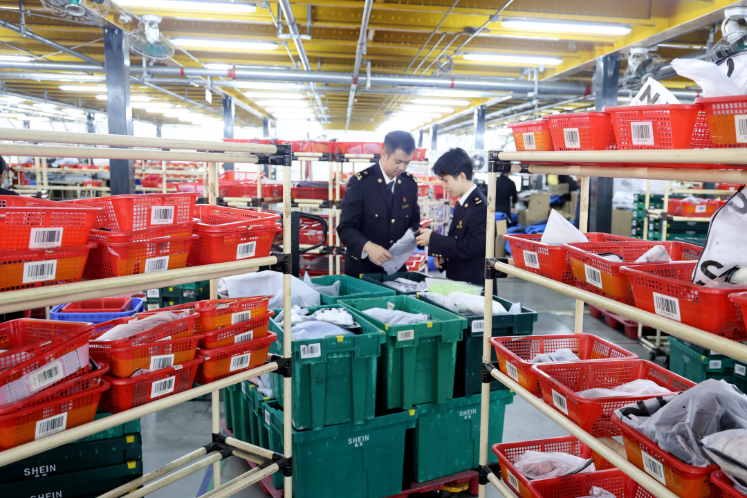广州海关所属南沙海关关员在南沙综合保税区内跨境电商企业进行监管。