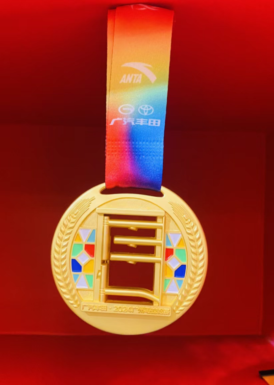 2024年广马完赛奖牌融入了广州西关大屋元素,其中“趟栊门”的设计不仅承载着西关老街的记忆,也体现了广州城市的历史风貌。“广州”二字与趟栊门整体的结构精妙契合、浑然一体,透过趟栊门,隐约可见广州城市地标建筑群,寓意着传统文化与现代繁华之间的完美交融。