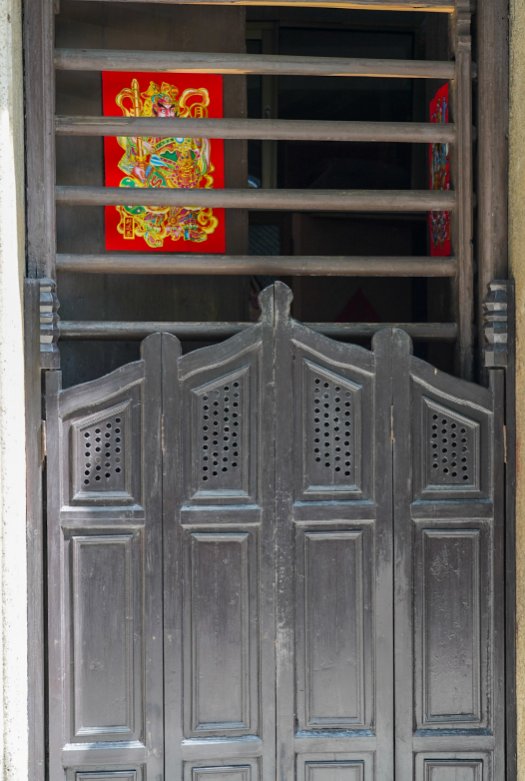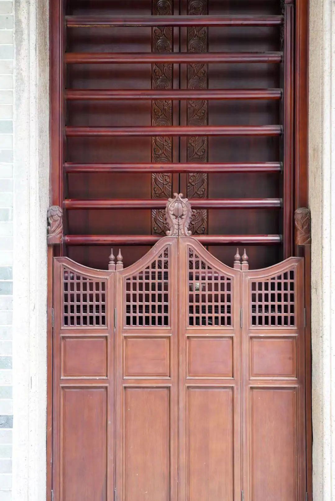 临街的第一扇门是屏风门,也叫矮脚吊扇门或者脚门,是从中间打开的折叠木板门,大多装饰着精美的木雕纹。既有一定的视线阻隔作用,以保屋内隐私,又可通风、采光。