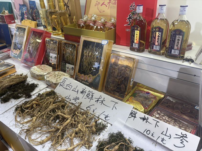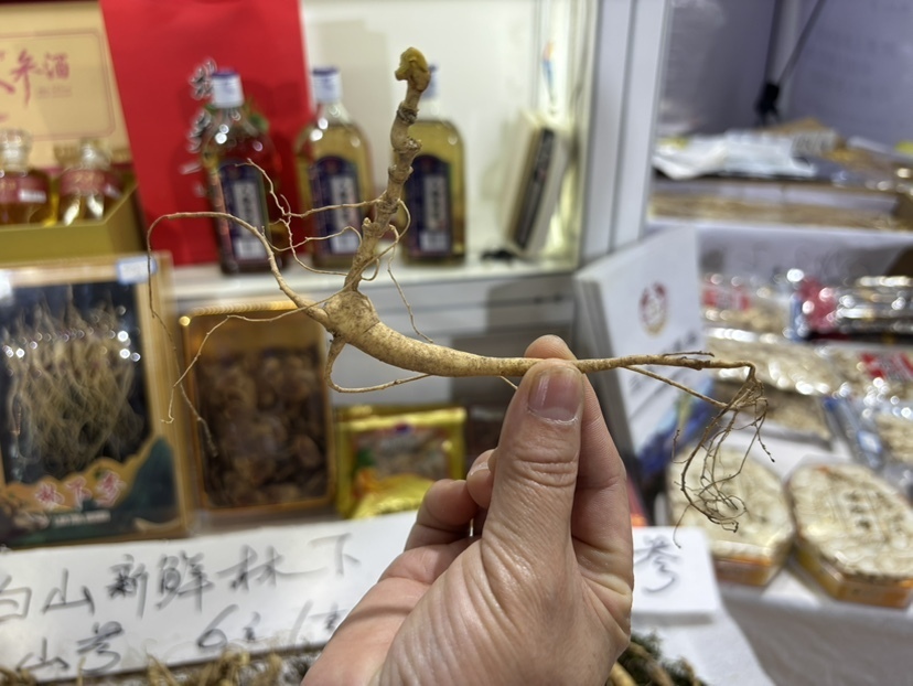 “一个‘坑’代表一个年轮,数‘坑’就能知道人参的年头。”人参养殖户在现场教起大家如何辨认人参的年份……这边摆放整颗人参和人参酒、人参片等较为传统的人参制品,吸引很多人前来询问;而另一边一些“新型”人参产品也受到参展观众尤其是年轻群体的关注。