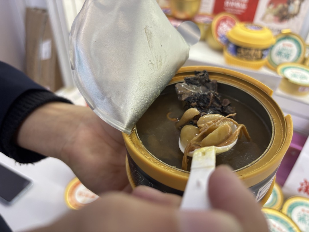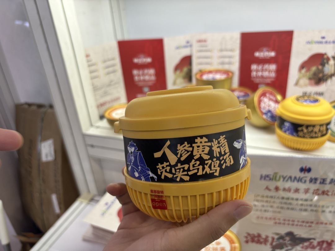 “这个人参黄精芡实乌鸡汤是自加热的,消费者将底部旋转一周便可以加热,然后食用了。特别适合上班一族,下班后不想做饭来一碗鸡汤,营养又方便。”参展商姚松向记者介绍道,此外还有人参牡丹燕窝、人参胶颜羹等即食产品。
