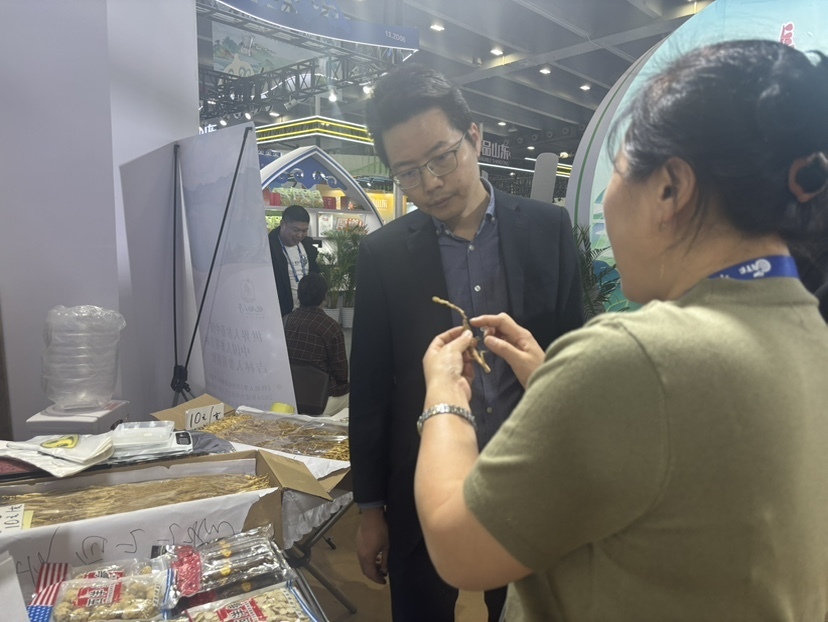 在第二十一届农交会,吉林省展区摆放的一排排人参吸引了许多目光。