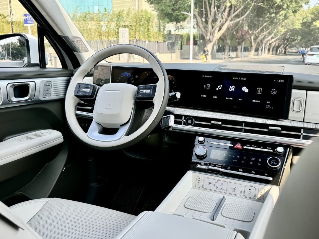 座舱内大牌双12.3英寸曲面联屏,其2500R的黄金曲率屏幕在制造、材料、品控、研发等方面的成本投入都远超同级的普通屏幕,对眼部也非常友好。此外,10英寸HUD抬头显示,是iPhone15pro最大亮度的5倍,强光不模糊。