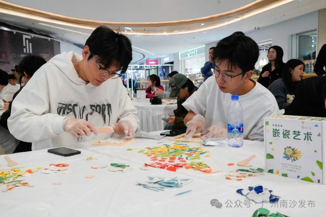 夜幕降临,青年大学生们前往南沙星河COCO Park参加“百人青年夜校”——非遗嵌瓷手作。他们用敲好制作成的各种颜色瓷片,通过镶嵌、粘接、堆砌成人物、山水花鸟等造型制成非遗嵌瓷。