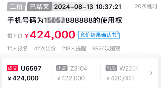 近日,江苏盐城市亭湖区人民法院在执行一起买卖合同纠纷案件中,通过网络司法拍卖程序成功处置了被执行人尾号“888888”的手机“靓号”,该手机号码使用权最终以424000元的价格成交。