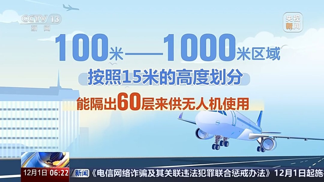 目前民用航空飞行的高度一般在6000米以上,1000米以下的飞行区域也就是我们常说的低空空域。倘若把100米到1000米的区域按照15米的高度划分,能隔出60层来供无人机使用。