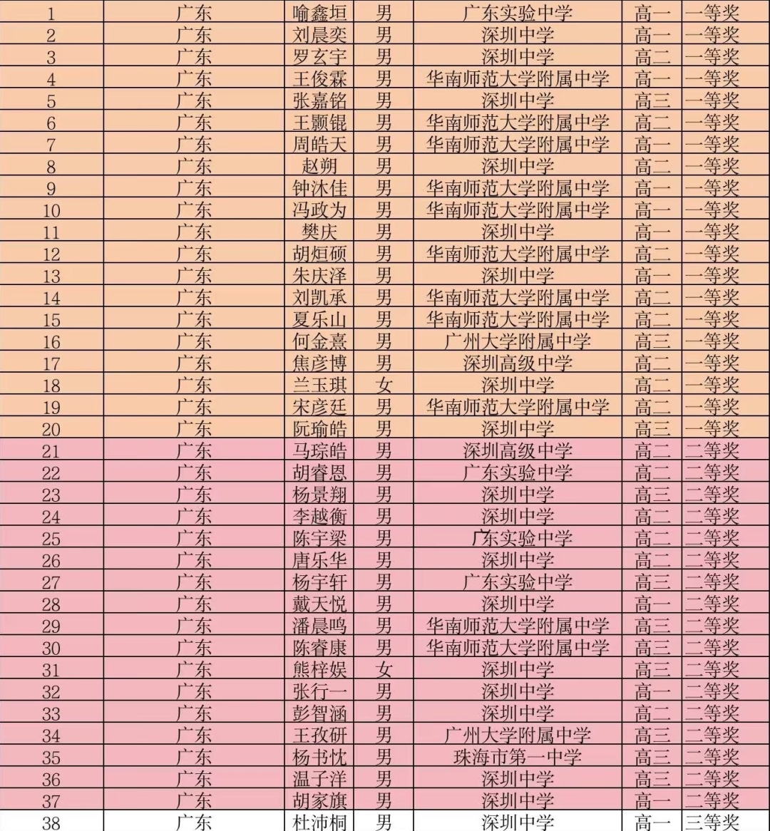 此次比赛广东省代表队有20人获得一等奖,也就是金牌。其中,华南师范大学附属中学9人,深圳中学8人,广东实验中学、广州大学附属中学、深圳高级中学各1人。8人为高一年级学生,9人为高二年级学生,3人为高三年级学生。