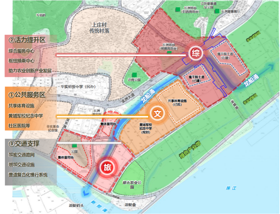 完善文教体卫等民生公服设施,激发长洲岛片区活力。一方面,规划充分结合长洲岛居民教育需求,推动黄埔军校纪念中学扩容搬迁至金州中路南侧,与共享体育设施用地进行统筹安排。统筹后中小学用地面积由4.3公顷增加到9.3公顷,解决纪念中学原址难以扩建问题,为学生提供良好的教育、体育空间。另一方面,规划保障已批专项规划社区医院需求,在龙船涌南侧落实0.97公顷医疗卫生用地,为上庄村及周边居民提供便捷的医疗服务。