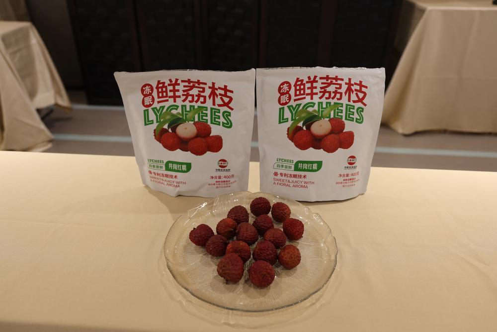 推介会上,还为嘉宾准备了“冻眠荔枝”这一从化新名片。作为全国荔枝重要产区和著名的荔枝之乡,从化荔枝种植面积已超30万亩,占广东省7.3%、广州市52.1%,是广东省荔枝最晚熟的产区。品种既有传统优势品种温泉双壳槐枝、钱岗糯米糍、流溪桂味,近年来又培育出优势晚熟品种井岗红糯、流溪红荔等。